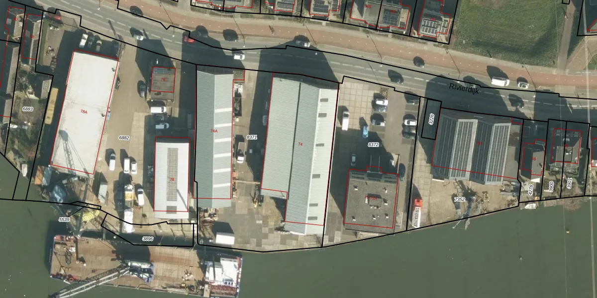 Het perceel waarop Rivierdijk 74-nut staat heeft een oppervlakte van 2674 m². Dit is een zeer groot perceel. De perceeloppervlakte wordt geregistreerd door het Kadaster. Gedetailleerde informatie over de maten van dit perceel kunt u vinden in het rapport Kadastrale kaart met maatvoering van Rivierdijk 74-nut.