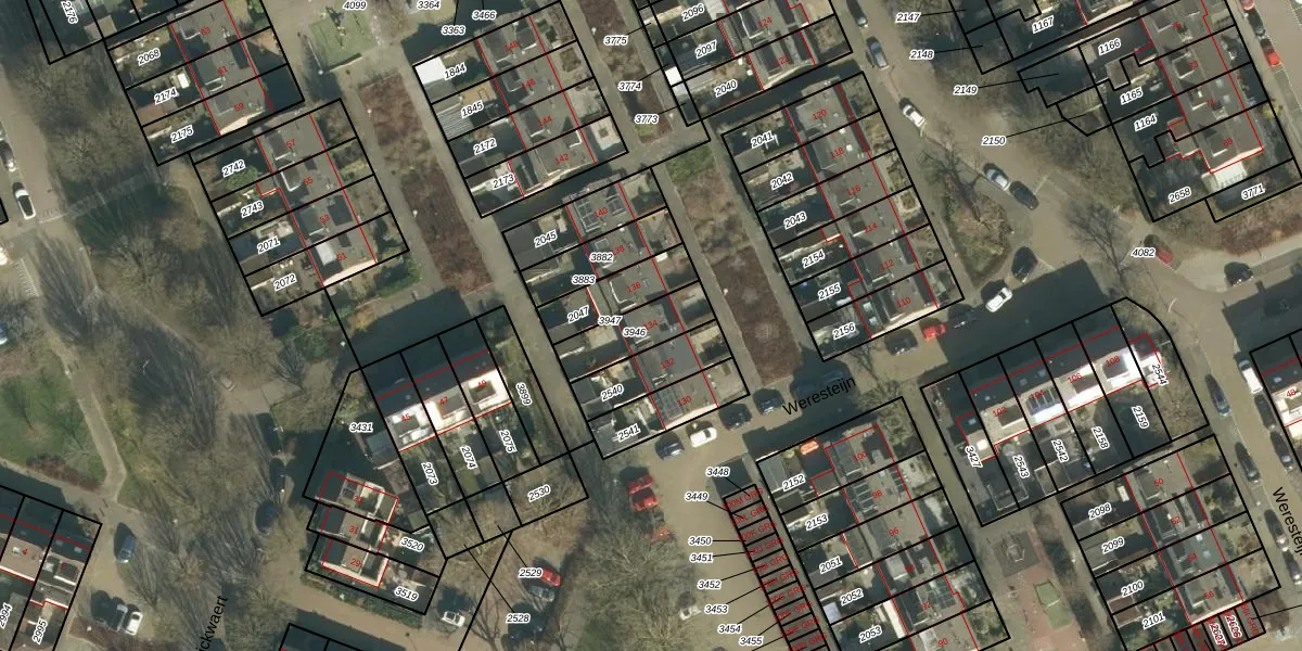 Het perceel waarop Weresteijn 134 staat heeft een oppervlakte van 154 m². Dit is een middelgroot perceel. De perceeloppervlakte wordt geregistreerd door het Kadaster. Gedetailleerde informatie over de maten van dit perceel kunt u vinden in het rapport Kadastrale kaart met maatvoering van Weresteijn 134.