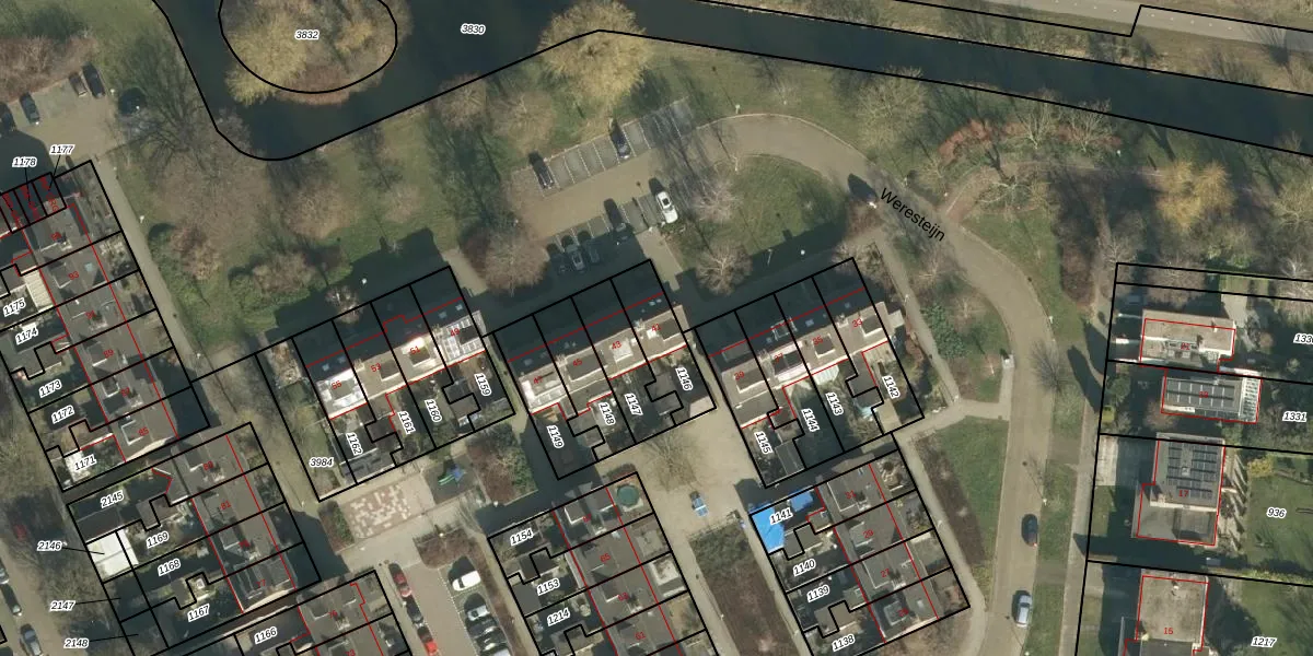 Het perceel waarop Weresteijn 41 staat heeft een oppervlakte van 163 m². Dit is een middelgroot perceel. De perceeloppervlakte wordt geregistreerd door het Kadaster. Gedetailleerde informatie over de maten van dit perceel kunt u vinden in het rapport Kadastrale kaart met maatvoering van Weresteijn 41.