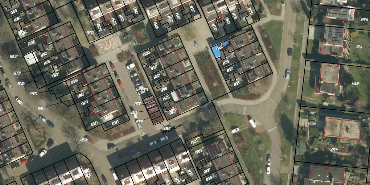 Het perceel waarop Weresteijn 59 staat heeft een oppervlakte van 159 m². Dit is een middelgroot perceel. De perceeloppervlakte wordt geregistreerd door het Kadaster. Gedetailleerde informatie over de maten van dit perceel kunt u vinden in het rapport Kadastrale kaart met maatvoering van Weresteijn 59.