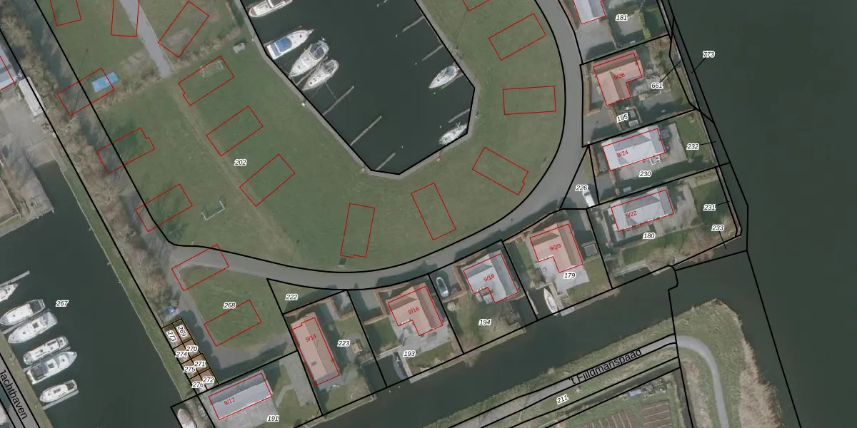Het perceel waarop Jachthaven 9-27 staat heeft een oppervlakte van 9968 m². Dit is een zeer groot perceel. De perceeloppervlakte wordt geregistreerd door het Kadaster. Gedetailleerde informatie over de maten van dit perceel kunt u vinden in het rapport Kadastrale kaart met maatvoering van Jachthaven 9-27.
