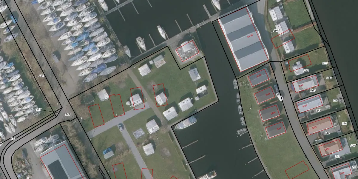 Het perceel waarop Jachthaven 9-3 staat heeft een oppervlakte van 9968 m². Dit is een zeer groot perceel. De perceeloppervlakte wordt geregistreerd door het Kadaster. Gedetailleerde informatie over de maten van dit perceel kunt u vinden in het rapport Kadastrale kaart met maatvoering van Jachthaven 9-3.