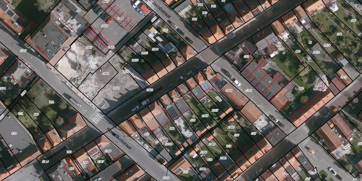 Dinsdagstraat 12 is gelegen op kadastraal perceel SLU00I2355. Deze kadastrale aanduiding is uniek en wordt gebruikt door het Kadaster om eigendomsrechten en andere zakelijke rechten vast te leggen. Het perceel maakt onderdeel uit van de kadastrale gemeente Sluis.