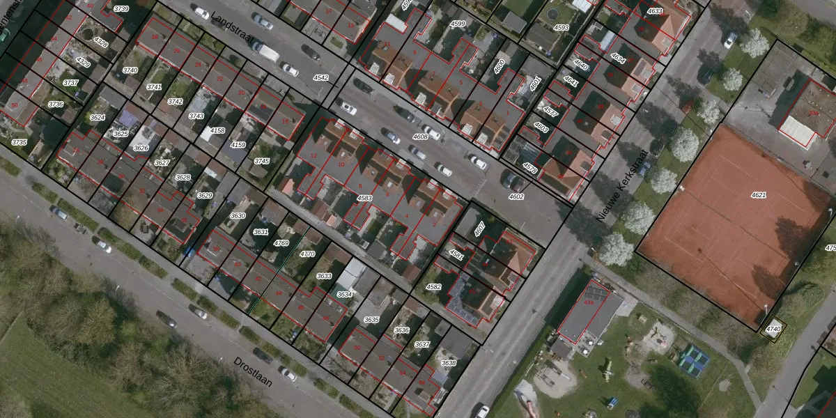 Het perceel waarop Landstraat 4 staat heeft een oppervlakte van 1093 m². Dit is een zeer groot perceel. De perceeloppervlakte wordt geregistreerd door het Kadaster. Gedetailleerde informatie over de maten van dit perceel kunt u vinden in het rapport Kadastrale kaart met maatvoering van Landstraat 4.