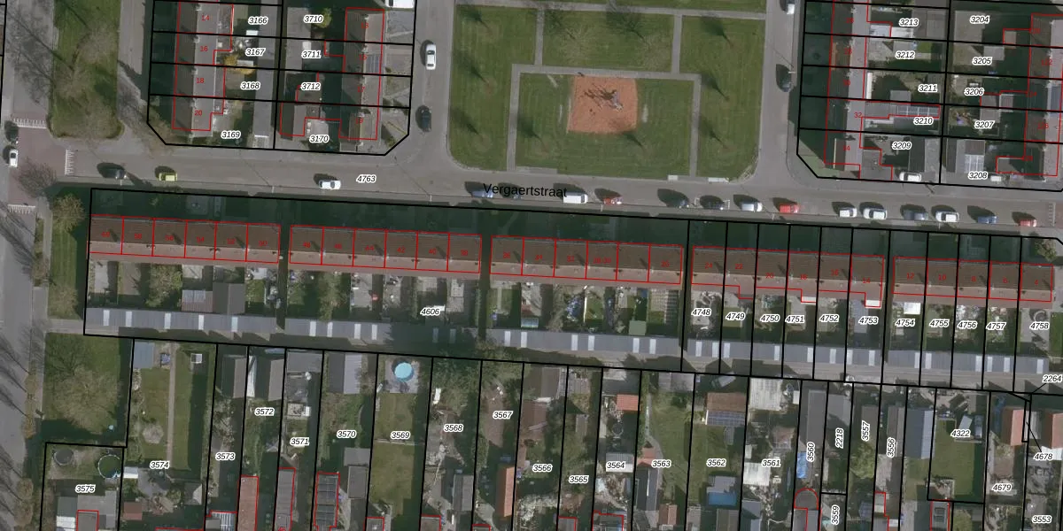 Het perceel waarop Vergaertstraat 34 staat heeft een oppervlakte van 3152 m². Dit is een zeer groot perceel. De perceeloppervlakte wordt geregistreerd door het Kadaster. Gedetailleerde informatie over de maten van dit perceel kunt u vinden in het rapport Kadastrale kaart met maatvoering van Vergaertstraat 34.