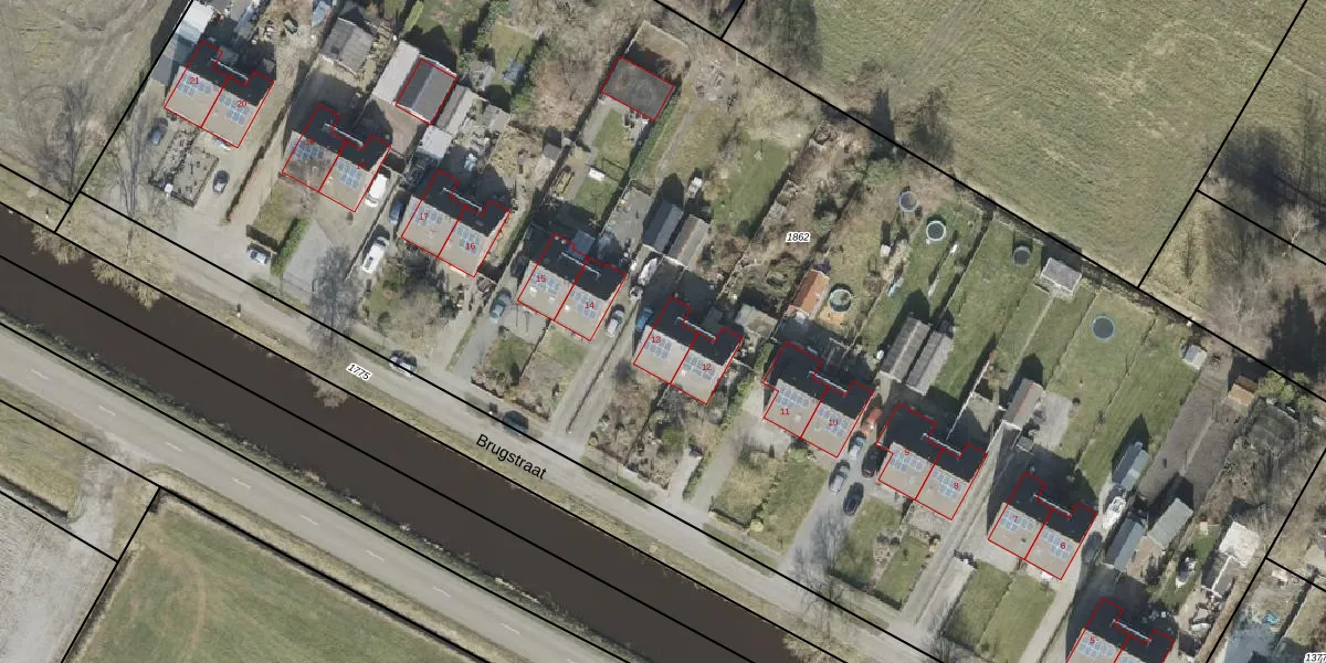 Brugstraat 13 is gelegen op kadastraal perceel SDE01D1862. Deze kadastrale aanduiding is uniek en wordt gebruikt door het Kadaster om eigendomsrechten en andere zakelijke rechten vast te leggen. Het perceel maakt onderdeel uit van de kadastrale gemeente Smilde.