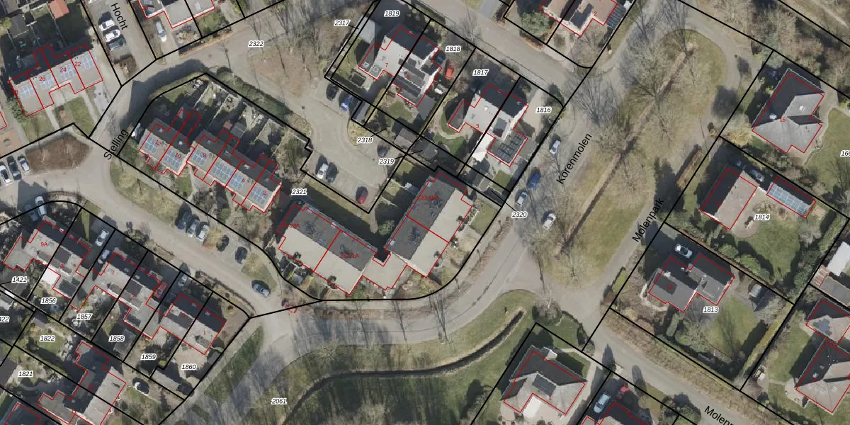 Het perceel waarop Korenmolen 33 staat heeft een oppervlakte van 2292 m². Dit is een zeer groot perceel. De perceeloppervlakte wordt geregistreerd door het Kadaster. Gedetailleerde informatie over de maten van dit perceel kunt u vinden in het rapport Kadastrale kaart met maatvoering van Korenmolen 33.