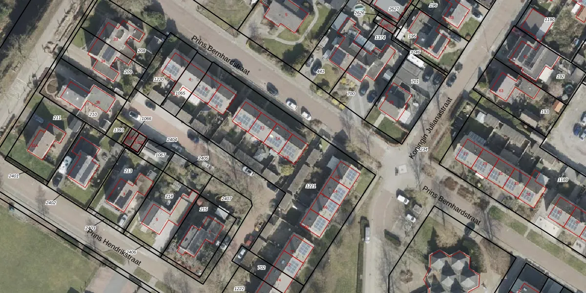 Het perceel waarop Prins Bernhardstraat 16 staat heeft een oppervlakte van 2045 m². Dit is een zeer groot perceel. De perceeloppervlakte wordt geregistreerd door het Kadaster. Gedetailleerde informatie over de maten van dit perceel kunt u vinden in het rapport Kadastrale kaart met maatvoering van Prins Bernhardstraat 16.