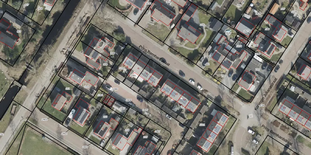 Het perceel waarop Prins Bernhardstraat 8 staat heeft een oppervlakte van 2045 m². Dit is een zeer groot perceel. De perceeloppervlakte wordt geregistreerd door het Kadaster. Gedetailleerde informatie over de maten van dit perceel kunt u vinden in het rapport Kadastrale kaart met maatvoering van Prins Bernhardstraat 8.