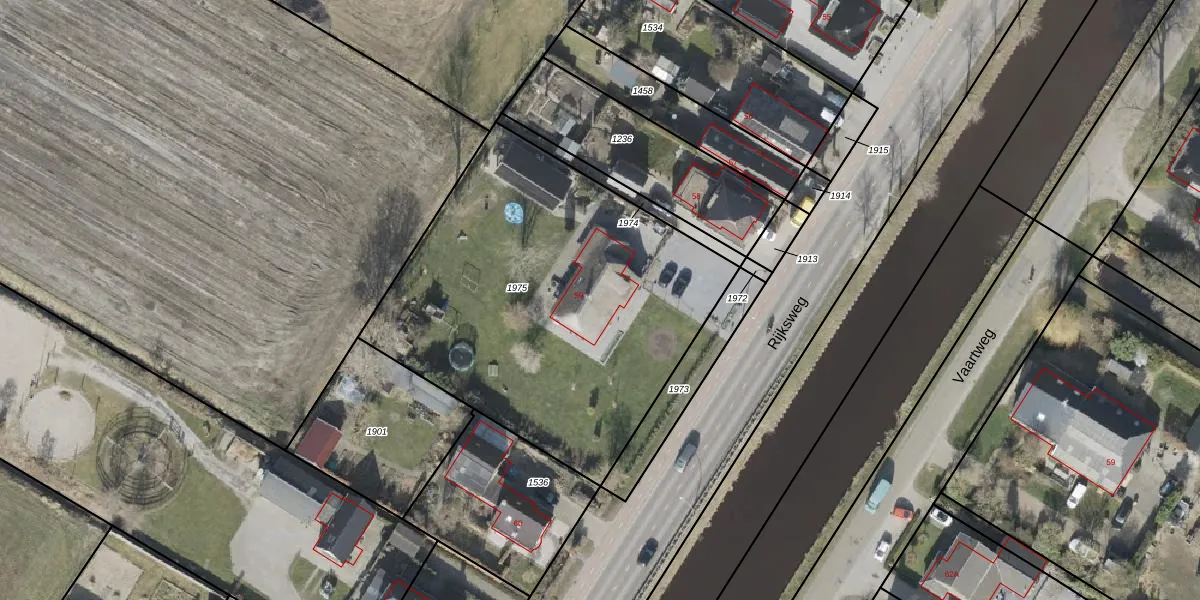 Het perceel waarop Rijksweg 59 staat heeft een oppervlakte van 1995 m². Dit is een zeer groot perceel. De perceeloppervlakte wordt geregistreerd door het Kadaster. Gedetailleerde informatie over de maten van dit perceel kunt u vinden in het rapport Kadastrale kaart met maatvoering van Rijksweg 59.