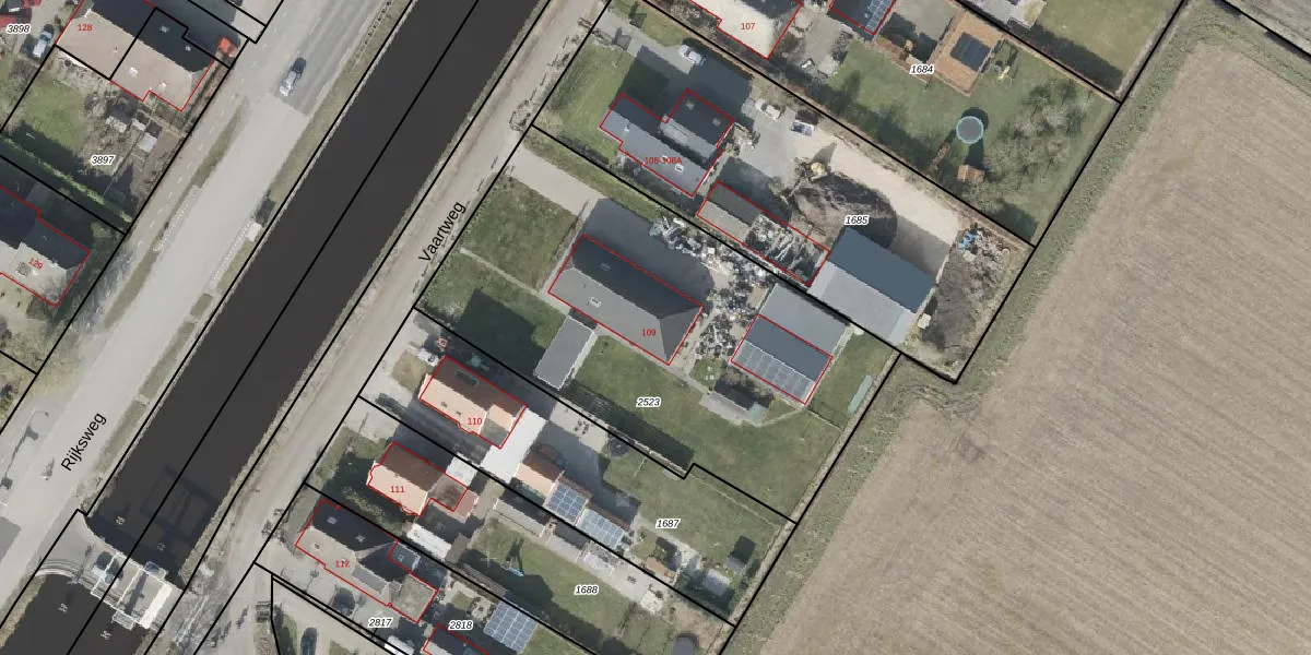 Vaartweg 109 is gelegen op kadastraal perceel SDE01E2523. Deze kadastrale aanduiding is uniek en wordt gebruikt door het Kadaster om eigendomsrechten en andere zakelijke rechten vast te leggen. Het perceel maakt onderdeel uit van de kadastrale gemeente Smilde.