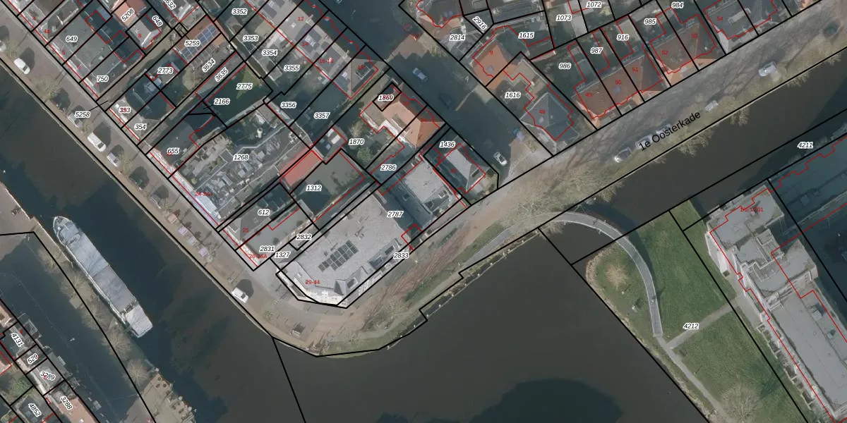 Het perceel waarop 1e Oosterkade 43 staat heeft een oppervlakte van 607 m². Dit is een groot perceel. De perceeloppervlakte wordt geregistreerd door het Kadaster. Gedetailleerde informatie over de maten van dit perceel kunt u vinden in het rapport Kadastrale kaart met maatvoering van 1e Oosterkade 43.