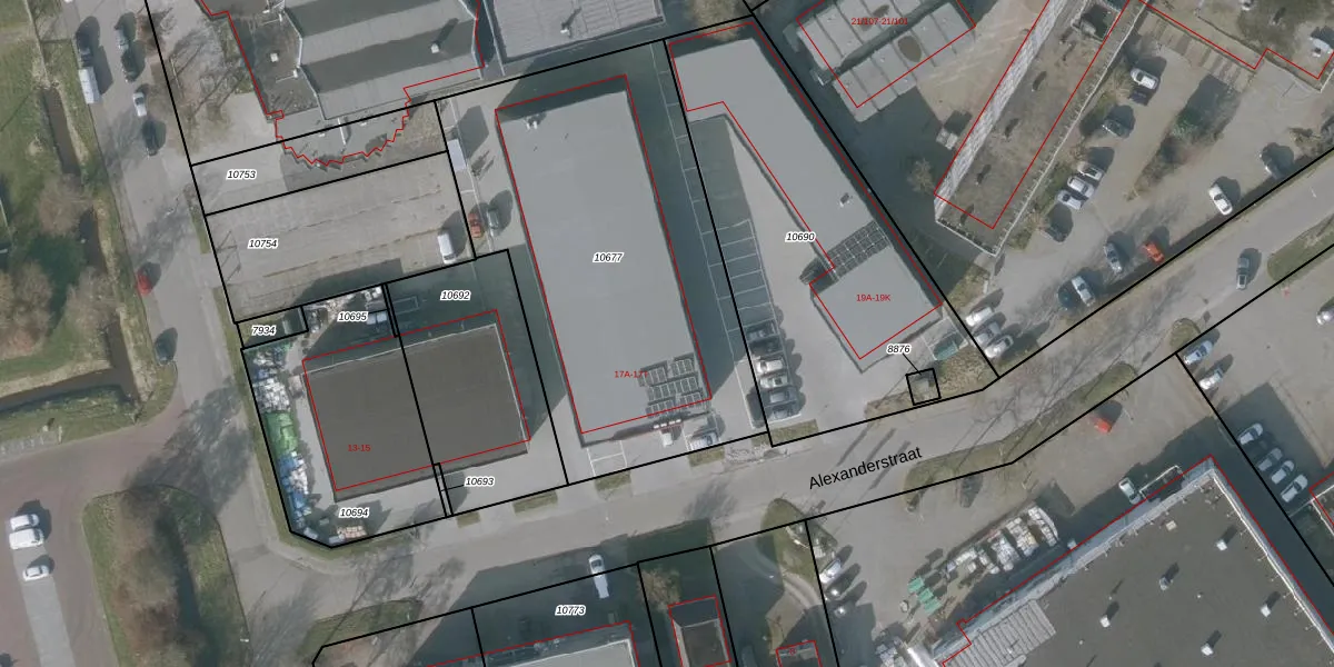 Het perceel waarop Alexanderstraat 17-T staat heeft een oppervlakte van 2007 m². Dit is een zeer groot perceel. De perceeloppervlakte wordt geregistreerd door het Kadaster. Gedetailleerde informatie over de maten van dit perceel kunt u vinden in het rapport Kadastrale kaart met maatvoering van Alexanderstraat 17-T.