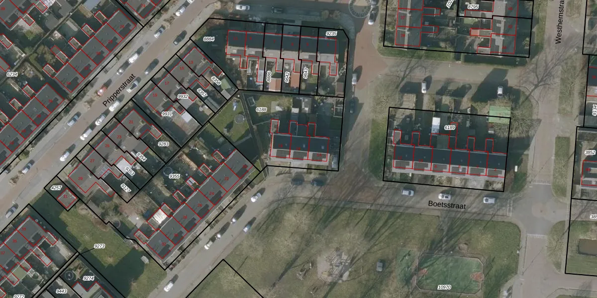 Het perceel waarop Boetsstraat 16 staat heeft een oppervlakte van 950 m². Dit is een groot perceel. De perceeloppervlakte wordt geregistreerd door het Kadaster. Gedetailleerde informatie over de maten van dit perceel kunt u vinden in het rapport Kadastrale kaart met maatvoering van Boetsstraat 16.