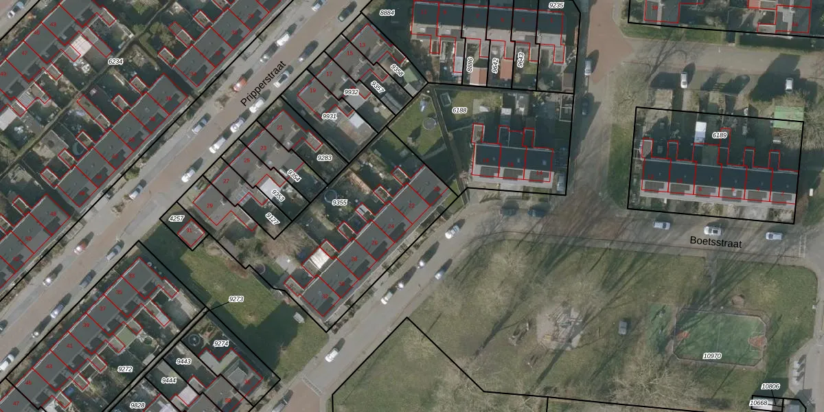 Het perceel waarop Boetsstraat 22 staat heeft een oppervlakte van 1367 m². Dit is een zeer groot perceel. De perceeloppervlakte wordt geregistreerd door het Kadaster. Gedetailleerde informatie over de maten van dit perceel kunt u vinden in het rapport Kadastrale kaart met maatvoering van Boetsstraat 22.