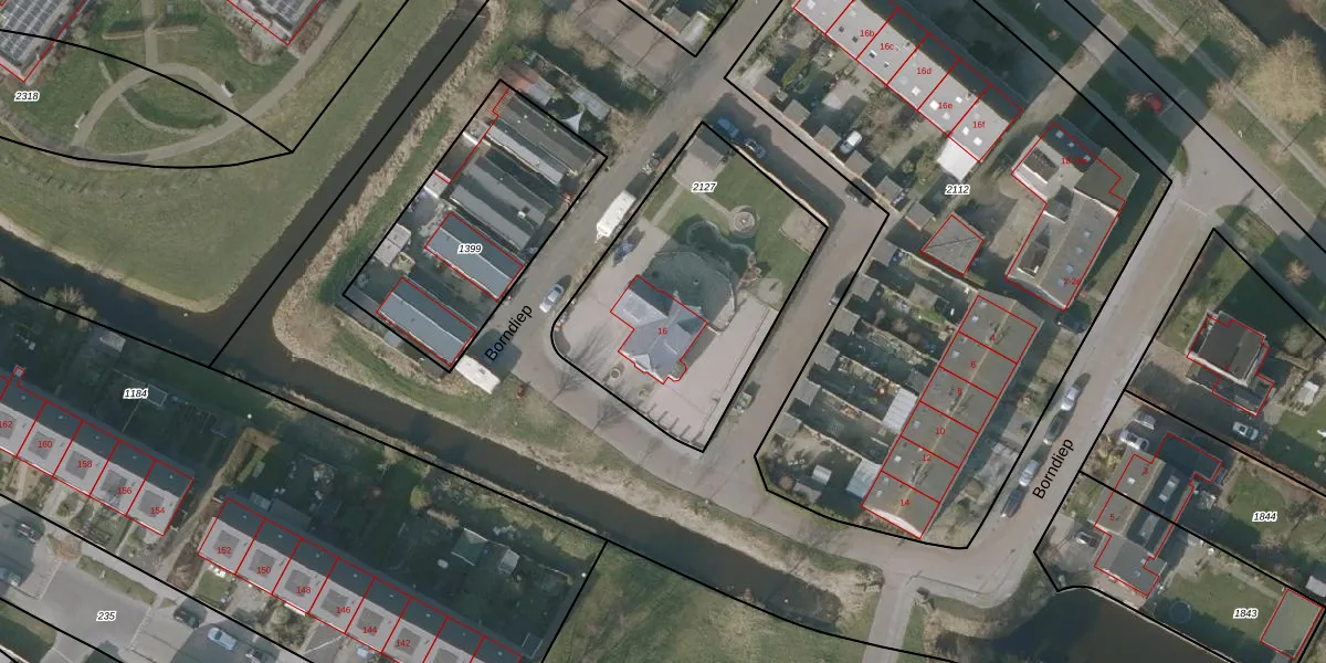Borndiep 16 is gelegen op kadastraal perceel SNE00E2127. Deze kadastrale aanduiding is uniek en wordt gebruikt door het Kadaster om eigendomsrechten en andere zakelijke rechten vast te leggen. Het perceel maakt onderdeel uit van de kadastrale gemeente Sneek.