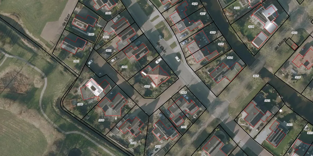 de Eker 16 is gelegen op kadastraal perceel SNE00D3020. Deze kadastrale aanduiding is uniek en wordt gebruikt door het Kadaster om eigendomsrechten en andere zakelijke rechten vast te leggen. Het perceel maakt onderdeel uit van de kadastrale gemeente Sneek.