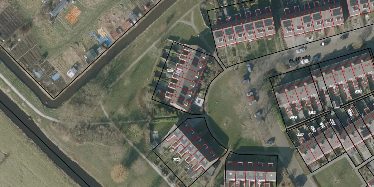 de Wieken 44 is gelegen op kadastraal perceel SNE00C6203. Deze kadastrale aanduiding is uniek en wordt gebruikt door het Kadaster om eigendomsrechten en andere zakelijke rechten vast te leggen. Het perceel maakt onderdeel uit van de kadastrale gemeente Sneek.