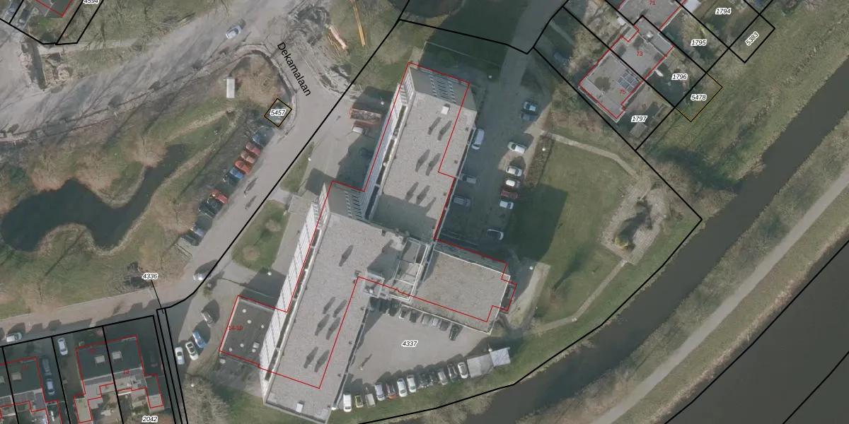 Het perceel waarop Dekamalaan 17-607 staat heeft een oppervlakte van 7665 m². Dit is een zeer groot perceel. De perceeloppervlakte wordt geregistreerd door het Kadaster. Gedetailleerde informatie over de maten van dit perceel kunt u vinden in het rapport Kadastrale kaart met maatvoering van Dekamalaan 17-607.