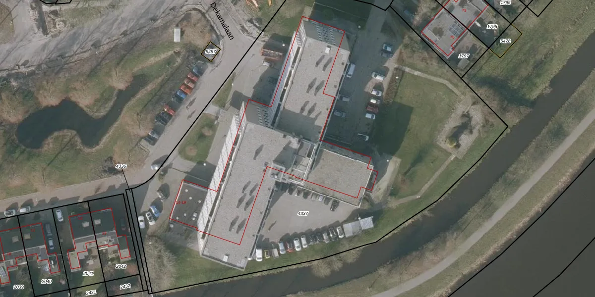 Het perceel waarop Dekamalaan 17-515 staat heeft een oppervlakte van 7665 m². Dit is een zeer groot perceel. De perceeloppervlakte wordt geregistreerd door het Kadaster. Gedetailleerde informatie over de maten van dit perceel kunt u vinden in het rapport Kadastrale kaart met maatvoering van Dekamalaan 17-515.