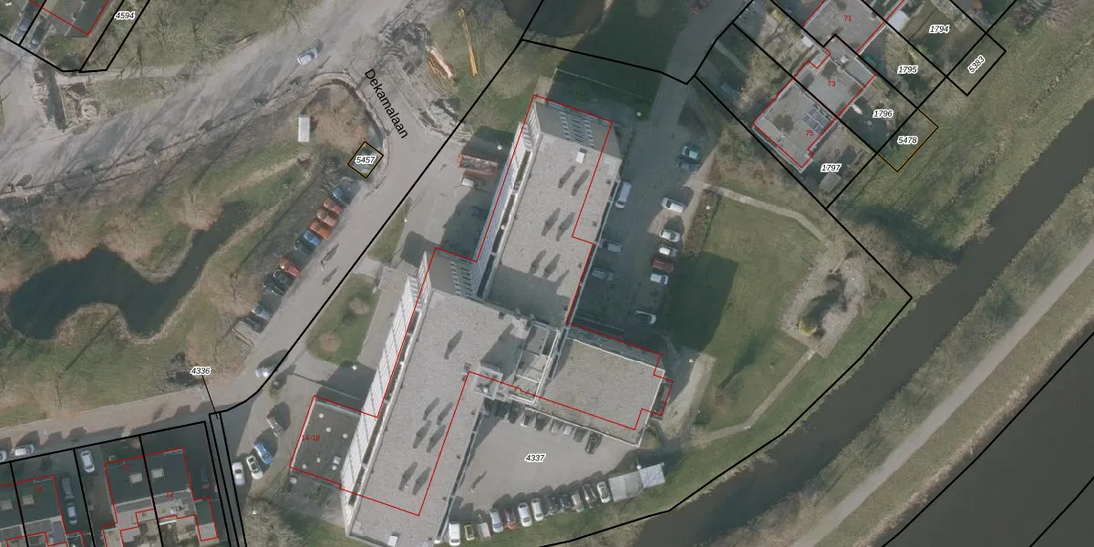Het perceel waarop Dekamalaan 17-506 staat heeft een oppervlakte van 7665 m². Dit is een zeer groot perceel. De perceeloppervlakte wordt geregistreerd door het Kadaster. Gedetailleerde informatie over de maten van dit perceel kunt u vinden in het rapport Kadastrale kaart met maatvoering van Dekamalaan 17-506.