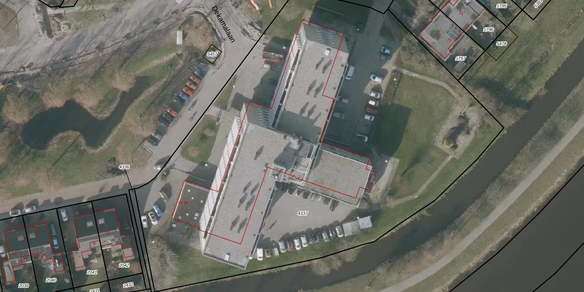 Het perceel waarop Dekamalaan 17-414 staat heeft een oppervlakte van 7665 m². Dit is een zeer groot perceel. De perceeloppervlakte wordt geregistreerd door het Kadaster. Gedetailleerde informatie over de maten van dit perceel kunt u vinden in het rapport Kadastrale kaart met maatvoering van Dekamalaan 17-414.