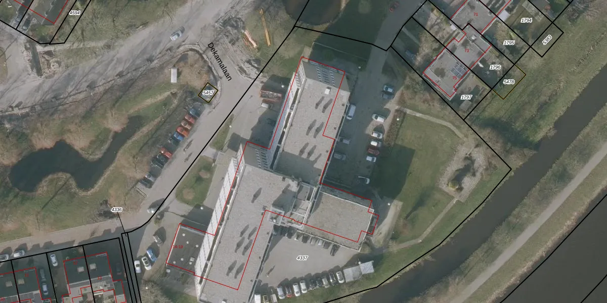 Het perceel waarop Dekamalaan 17-405 staat heeft een oppervlakte van 7665 m². Dit is een zeer groot perceel. De perceeloppervlakte wordt geregistreerd door het Kadaster. Gedetailleerde informatie over de maten van dit perceel kunt u vinden in het rapport Kadastrale kaart met maatvoering van Dekamalaan 17-405.
