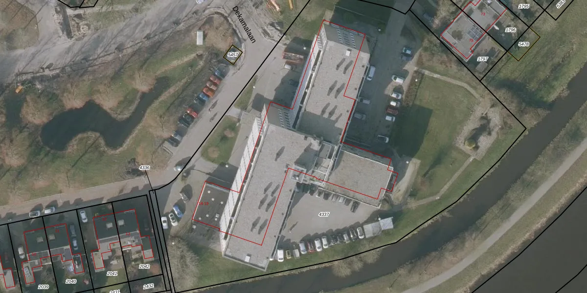 Het perceel waarop Dekamalaan 17-116 staat heeft een oppervlakte van 7665 m². Dit is een zeer groot perceel. De perceeloppervlakte wordt geregistreerd door het Kadaster. Gedetailleerde informatie over de maten van dit perceel kunt u vinden in het rapport Kadastrale kaart met maatvoering van Dekamalaan 17-116.