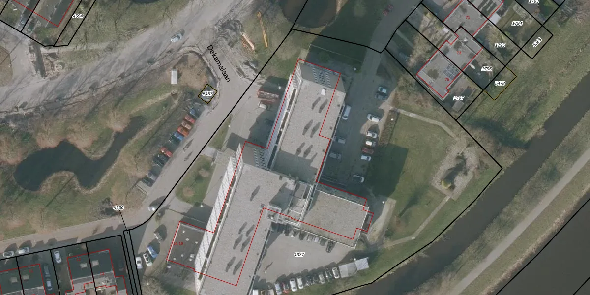 Het perceel waarop Dekamalaan 17-305 staat heeft een oppervlakte van 7665 m². Dit is een zeer groot perceel. De perceeloppervlakte wordt geregistreerd door het Kadaster. Gedetailleerde informatie over de maten van dit perceel kunt u vinden in het rapport Kadastrale kaart met maatvoering van Dekamalaan 17-305.