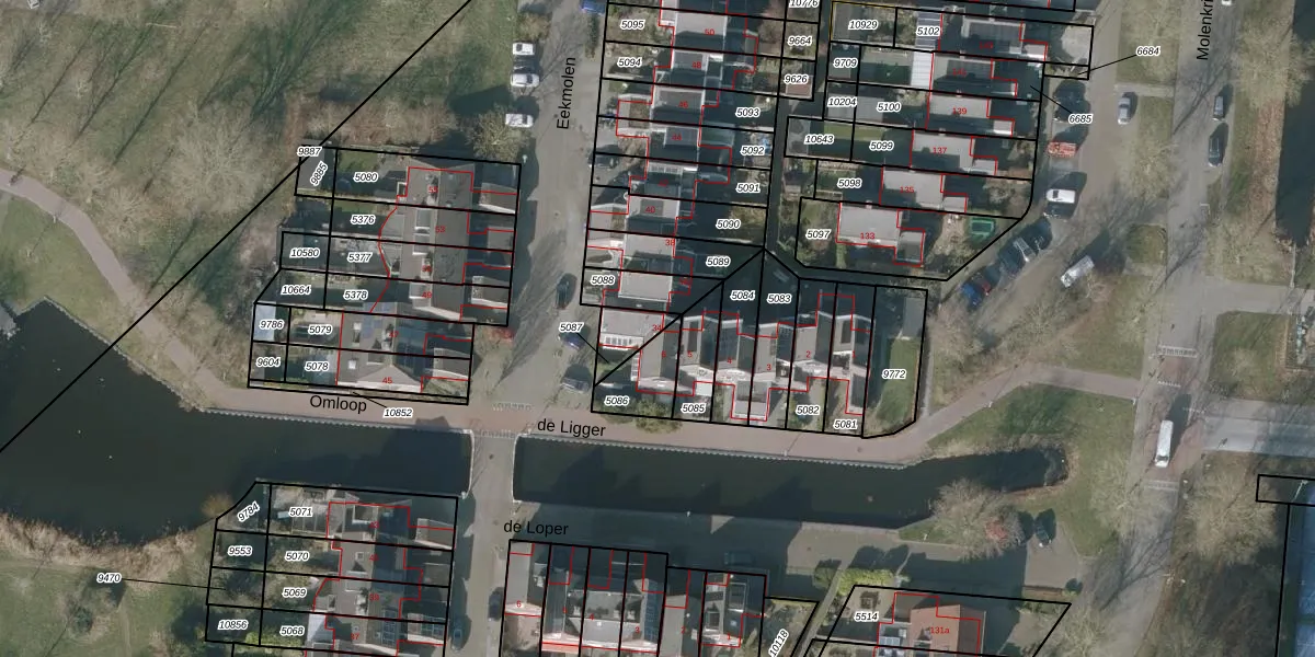 Het perceel waarop Eekmolen 34 staat heeft een oppervlakte van 76 m². Dit is een klein perceel. De perceeloppervlakte wordt geregistreerd door het Kadaster. Gedetailleerde informatie over de maten van dit perceel kunt u vinden in het rapport Kadastrale kaart met maatvoering van Eekmolen 34.