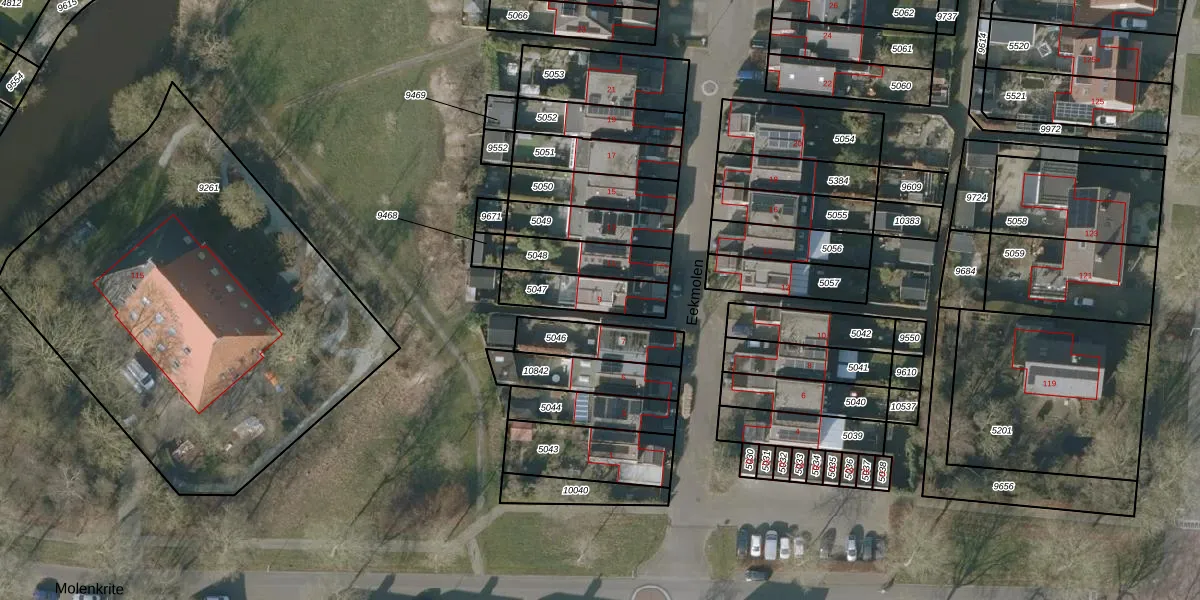 Het perceel waarop Eekmolen 9 staat heeft een oppervlakte van 163 m². Dit is een middelgroot perceel. De perceeloppervlakte wordt geregistreerd door het Kadaster. Gedetailleerde informatie over de maten van dit perceel kunt u vinden in het rapport Kadastrale kaart met maatvoering van Eekmolen 9.
