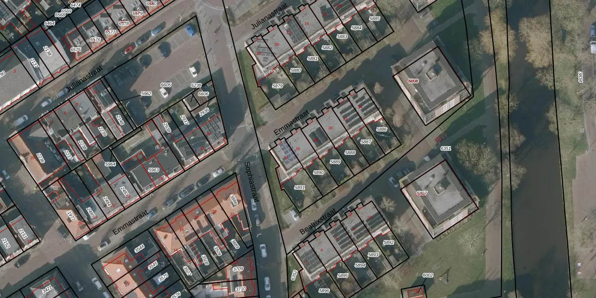 Emmastraat 26 is gelegen op kadastraal perceel SNE00A5890. Deze kadastrale aanduiding is uniek en wordt gebruikt door het Kadaster om eigendomsrechten en andere zakelijke rechten vast te leggen. Het perceel maakt onderdeel uit van de kadastrale gemeente Sneek.