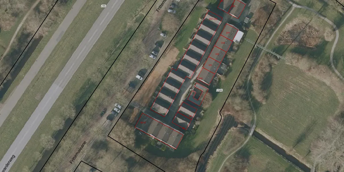 Het perceel waarop Frittemaleane 121 staat heeft een oppervlakte van 5370 m². Dit is een zeer groot perceel. De perceeloppervlakte wordt geregistreerd door het Kadaster. Gedetailleerde informatie over de maten van dit perceel kunt u vinden in het rapport Kadastrale kaart met maatvoering van Frittemaleane 121.