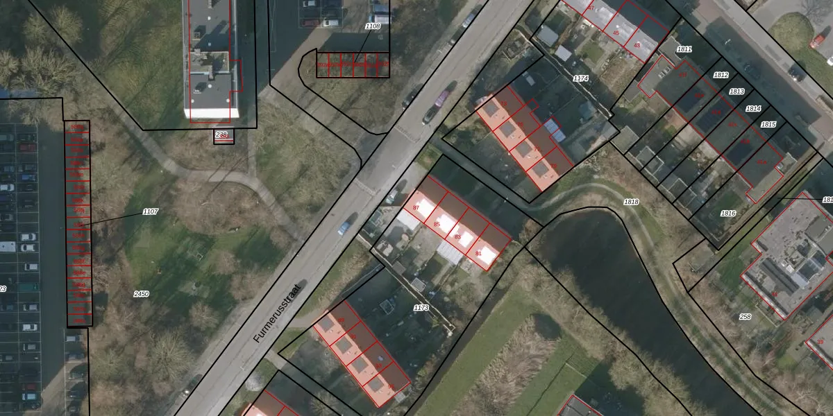 Het perceel waarop Furmerusstraat 87 staat heeft een oppervlakte van 3637 m². Dit is een zeer groot perceel. De perceeloppervlakte wordt geregistreerd door het Kadaster. Gedetailleerde informatie over de maten van dit perceel kunt u vinden in het rapport Kadastrale kaart met maatvoering van Furmerusstraat 87.