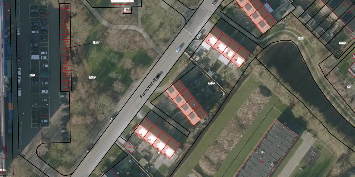 Het perceel waarop Furmerusstraat 89 staat heeft een oppervlakte van 3637 m². Dit is een zeer groot perceel. De perceeloppervlakte wordt geregistreerd door het Kadaster. Gedetailleerde informatie over de maten van dit perceel kunt u vinden in het rapport Kadastrale kaart met maatvoering van Furmerusstraat 89.
