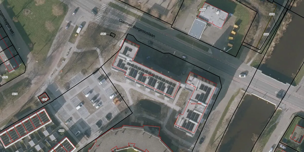 Het perceel waarop Goeman Borgesiuslaan 3-105 staat heeft een oppervlakte van 1,1 ha. Dit is een zeer groot perceel. De perceeloppervlakte wordt geregistreerd door het Kadaster. Gedetailleerde informatie over de maten van dit perceel kunt u vinden in het rapport Kadastrale kaart met maatvoering van Goeman Borgesiuslaan 3-105.