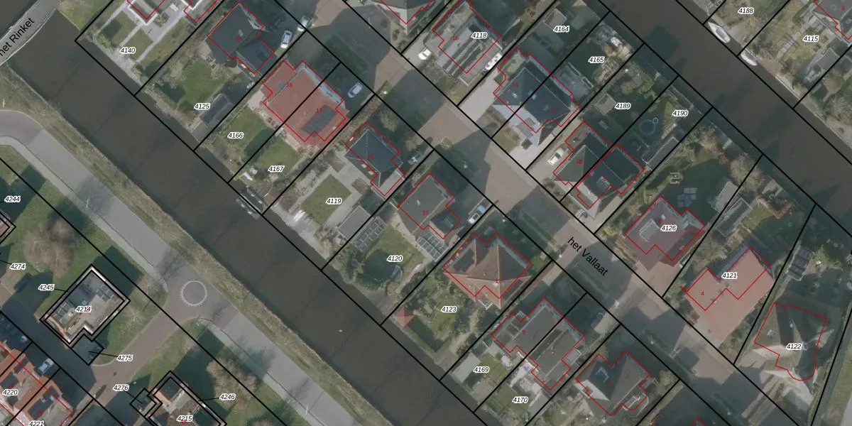 het Vallaat 13 is gelegen op kadastraal perceel SNE00D4120. Deze kadastrale aanduiding is uniek en wordt gebruikt door het Kadaster om eigendomsrechten en andere zakelijke rechten vast te leggen. Het perceel maakt onderdeel uit van de kadastrale gemeente Sneek.
