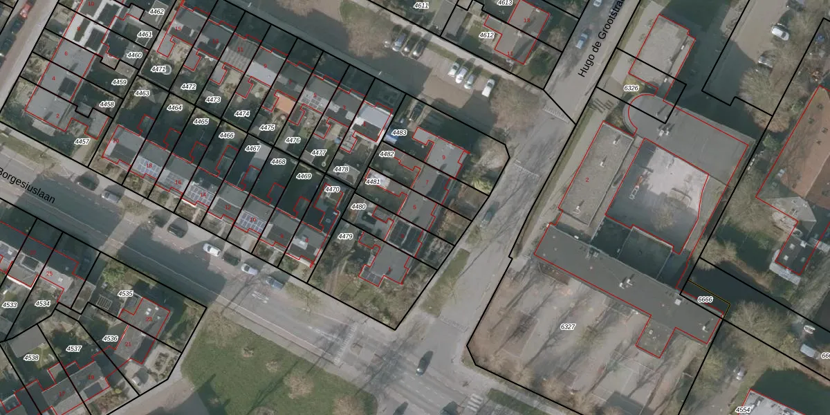 Hugo de Grootstraat 5 is gelegen op kadastraal perceel SNE00A4481. Deze kadastrale aanduiding is uniek en wordt gebruikt door het Kadaster om eigendomsrechten en andere zakelijke rechten vast te leggen. Het perceel maakt onderdeel uit van de kadastrale gemeente Sneek.