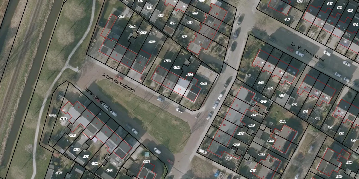 Johan de Wittplein 13 is gelegen op kadastraal perceel SNE00A4721. Deze kadastrale aanduiding is uniek en wordt gebruikt door het Kadaster om eigendomsrechten en andere zakelijke rechten vast te leggen. Het perceel maakt onderdeel uit van de kadastrale gemeente Sneek.