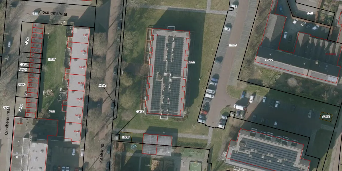Het perceel waarop Kaatsland 1-108 staat heeft een oppervlakte van 8705 m². Dit is een zeer groot perceel. De perceeloppervlakte wordt geregistreerd door het Kadaster. Gedetailleerde informatie over de maten van dit perceel kunt u vinden in het rapport Kadastrale kaart met maatvoering van Kaatsland 1-108.