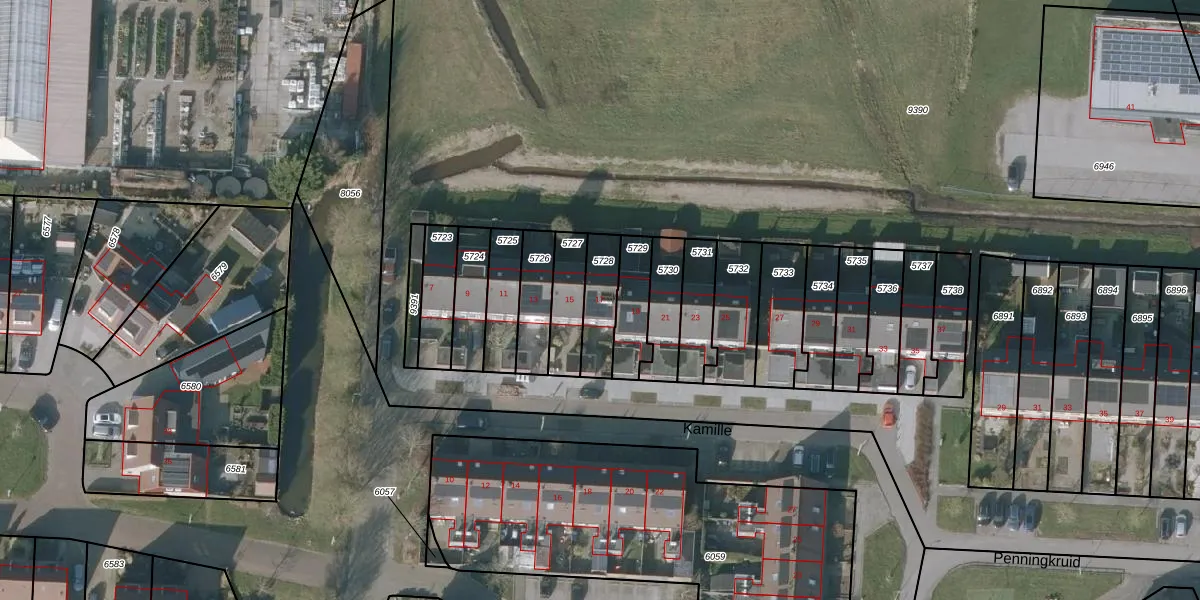 Het perceel waarop Kamille 17 staat heeft een oppervlakte van 130 m². Dit is een middelgroot perceel. De perceeloppervlakte wordt geregistreerd door het Kadaster. Gedetailleerde informatie over de maten van dit perceel kunt u vinden in het rapport Kadastrale kaart met maatvoering van Kamille 17.