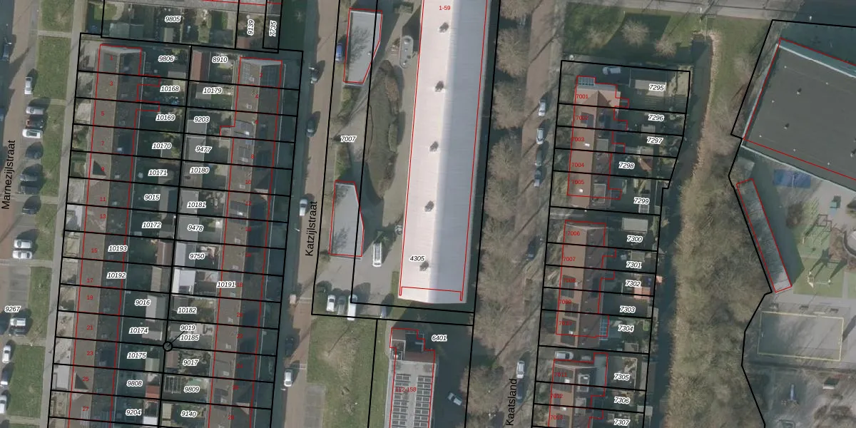 Het perceel waarop Katzijlstraat 23 staat heeft een oppervlakte van 2352 m². Dit is een zeer groot perceel. De perceeloppervlakte wordt geregistreerd door het Kadaster. Gedetailleerde informatie over de maten van dit perceel kunt u vinden in het rapport Kadastrale kaart met maatvoering van Katzijlstraat 23.