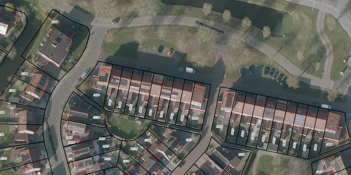 Koeriersterswei 14 is gelegen op kadastraal perceel SNE00E1421. Deze kadastrale aanduiding is uniek en wordt gebruikt door het Kadaster om eigendomsrechten en andere zakelijke rechten vast te leggen. Het perceel maakt onderdeel uit van de kadastrale gemeente Sneek.