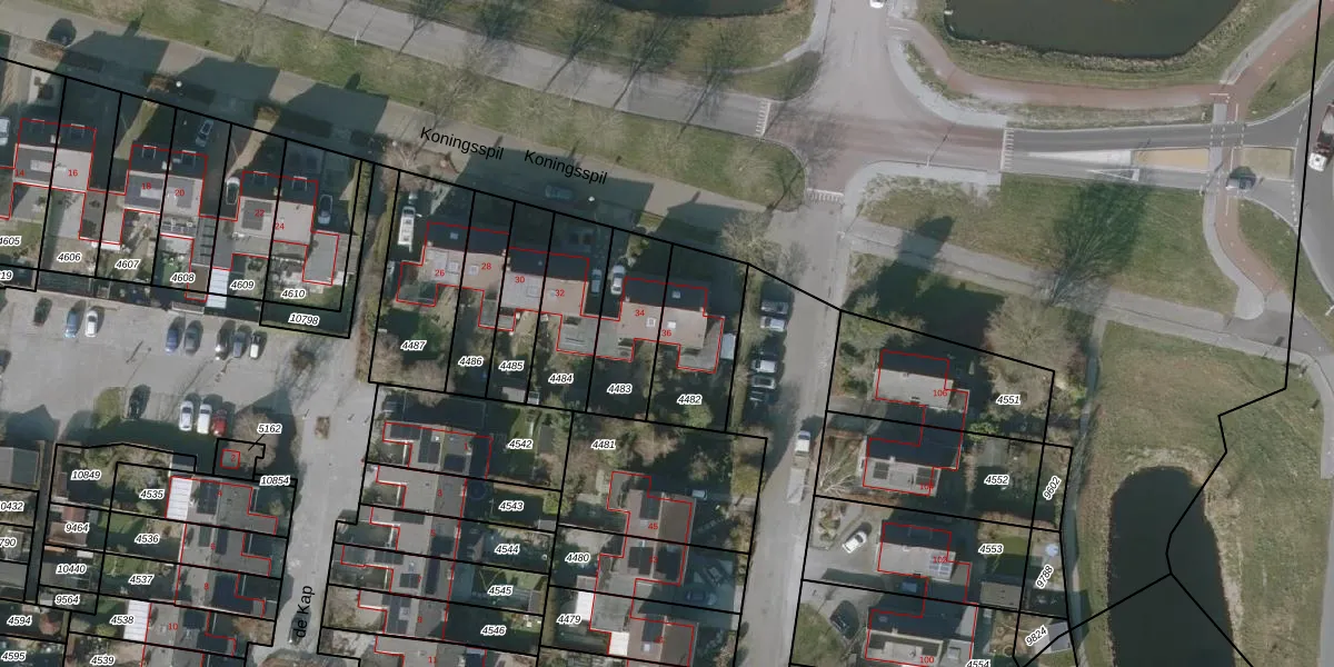 Het perceel waarop Koningsspil 36 staat heeft een oppervlakte van 303 m². Dit is een groot perceel. De perceeloppervlakte wordt geregistreerd door het Kadaster. Gedetailleerde informatie over de maten van dit perceel kunt u vinden in het rapport Kadastrale kaart met maatvoering van Koningsspil 36.