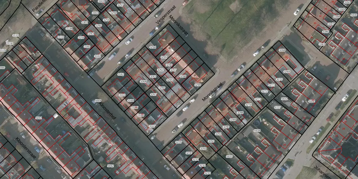 Het perceel waarop Monnikstraat 5 staat heeft een oppervlakte van 107 m². Dit is een middelgroot perceel. De perceeloppervlakte wordt geregistreerd door het Kadaster. Gedetailleerde informatie over de maten van dit perceel kunt u vinden in het rapport Kadastrale kaart met maatvoering van Monnikstraat 5.