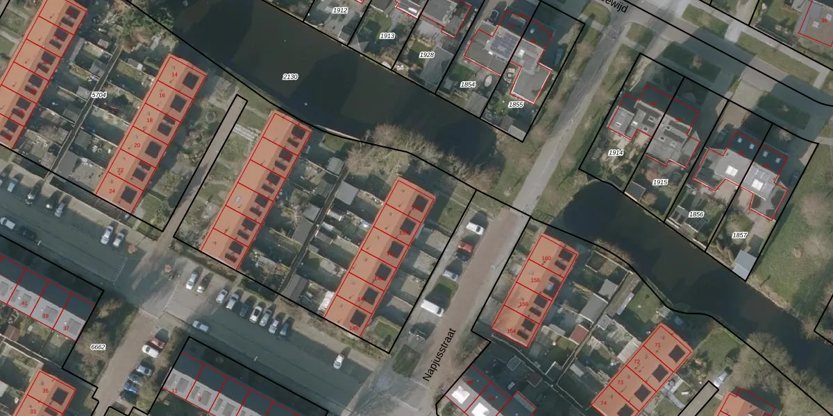 Het perceel waarop Napjusstraat 155 staat heeft een oppervlakte van 5055 m². Dit is een zeer groot perceel. De perceeloppervlakte wordt geregistreerd door het Kadaster. Gedetailleerde informatie over de maten van dit perceel kunt u vinden in het rapport Kadastrale kaart met maatvoering van Napjusstraat 155.