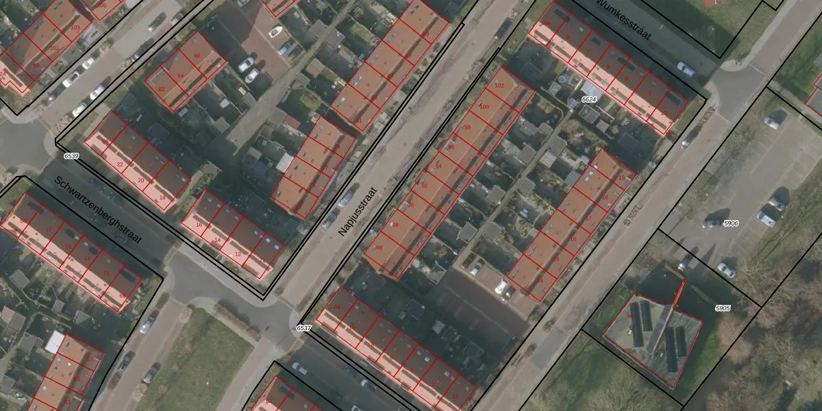 Napjusstraat 90 is gelegen op kadastraal perceel SNE00A6624. Deze kadastrale aanduiding is uniek en wordt gebruikt door het Kadaster om eigendomsrechten en andere zakelijke rechten vast te leggen. Het perceel maakt onderdeel uit van de kadastrale gemeente Sneek.