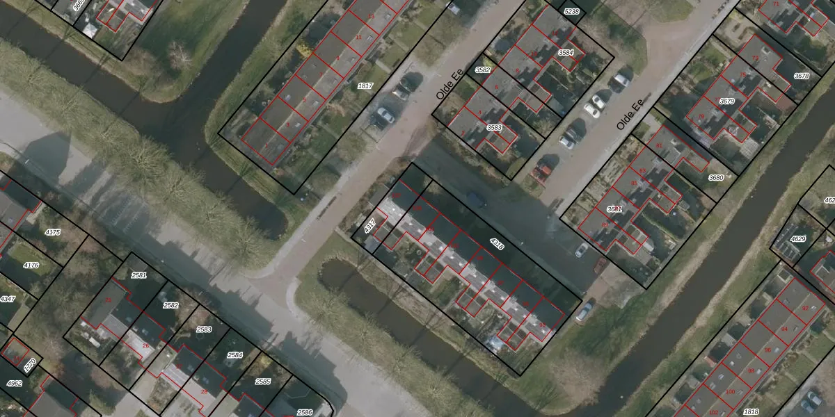 Olde Ee 105 is gelegen op kadastraal perceel SNE00D4318. Deze kadastrale aanduiding is uniek en wordt gebruikt door het Kadaster om eigendomsrechten en andere zakelijke rechten vast te leggen. Het perceel maakt onderdeel uit van de kadastrale gemeente Sneek.
