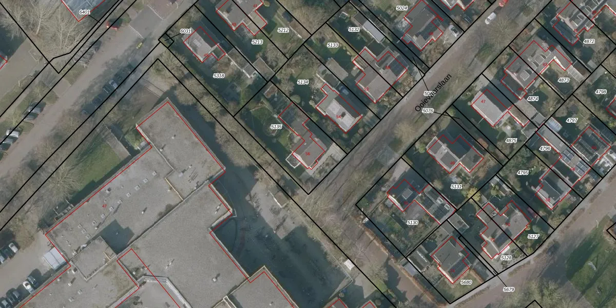Het perceel waarop Ooievaarslaan 56 staat heeft een oppervlakte van 616 m². Dit is een groot perceel. De perceeloppervlakte wordt geregistreerd door het Kadaster. Gedetailleerde informatie over de maten van dit perceel kunt u vinden in het rapport Kadastrale kaart met maatvoering van Ooievaarslaan 56.