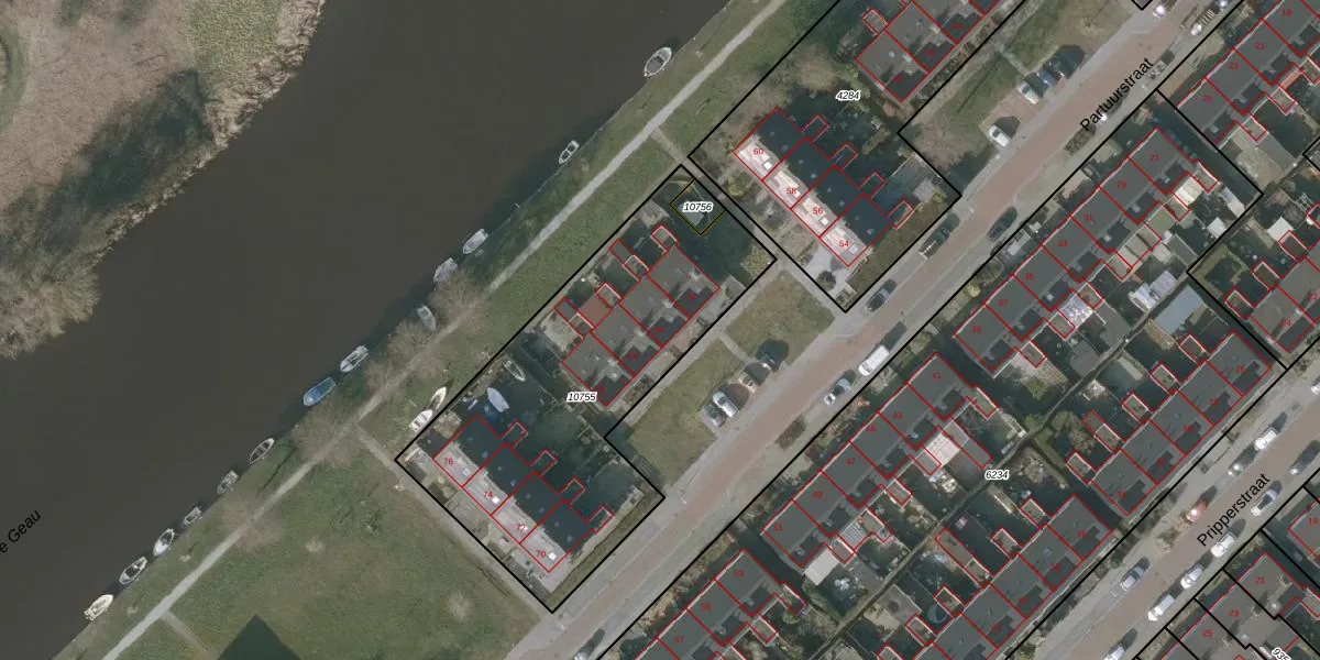 Partuurstraat 64 is gelegen op kadastraal perceel SNE00C10755. Deze kadastrale aanduiding is uniek en wordt gebruikt door het Kadaster om eigendomsrechten en andere zakelijke rechten vast te leggen. Het perceel maakt onderdeel uit van de kadastrale gemeente Sneek.